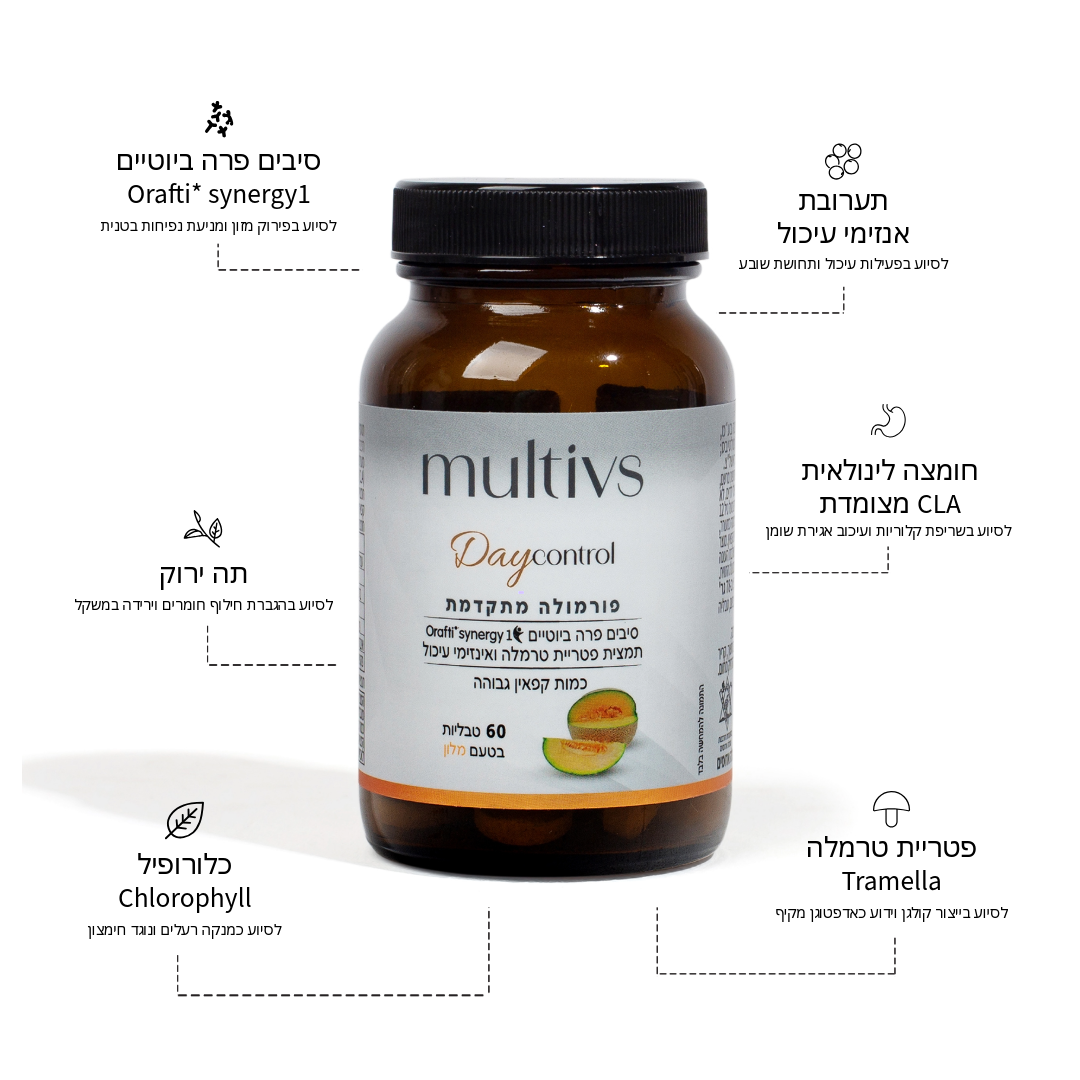 פורמולת תוסף התזונה - דיי קונטרול כוללת את אותם רכיבים מצוינים בכל הטעמים המוצעים למכירה. הוראות השימוש גם הן זהות: עד 3 טבליות ביום בתוספת שתיית מים.